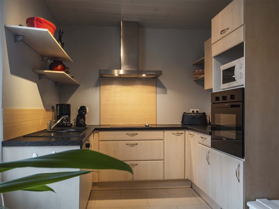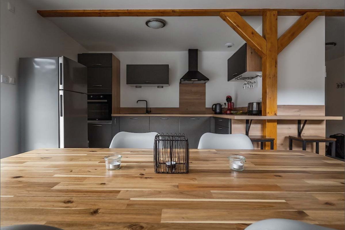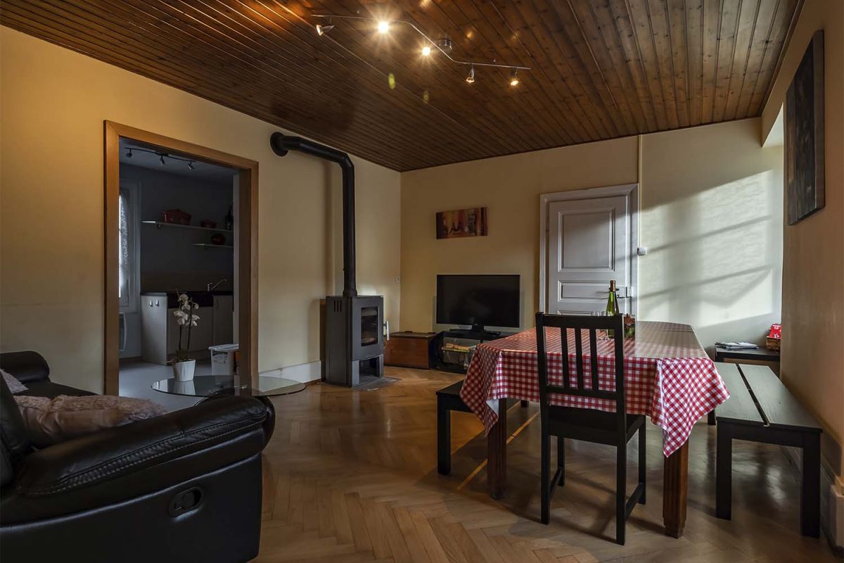Le salon/salle à manger est composé d’un canapé, une grande table, une TV et d’un poêle à bois (bois mis à disposition). La cuisine est entièrement équipée (lave-vaisselle, frigo, four, MO, cafetière). La salle de bain/WC comprend une douche et un lave-linge.