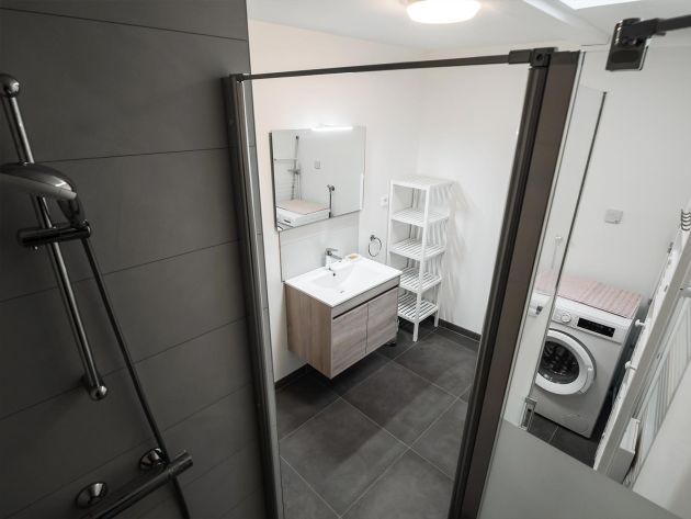 Au 1er étage, vous disposerez notamment d’une chambre avec 1 lit double, d’une salle de bain avec douche (machine à laver, sèche-linge), ainsi que de toilettes séparées. Une grande pièce de vie vous accueillera également pour vos moments de détente, avec une cuisine ouverte entièrement équipée, un salon avec télévision, ainsi qu’une grande terrasse, avec mobilier de jardin, ouverte sur le paysage environnant.